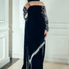 Adeena blue velvet shirt presents handmade stones, thread detailing, and zardozi sleeves, paired with a diamante border running across the shirt. Comes with an attached dupatta for effortless elegance.