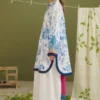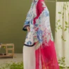 The dupatta is printed with blue roses and finished with blue and olive green borders on a hot pink base. The shirt features blue rose and floral prints on pearl white. The trouser is detailed with a blue scalloped border on pearl white.