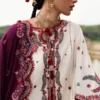 A vision of unblemished elegance, this unstitched ivory ensemble offers a refined take on the classic karandi silhouette. The shirt is beautifully elevated by intricate delicate embroidery and borring details. A striking contrast is achieved with the accompanying purple embroidered karandi shawl, which introduces a vibrant pop of color. The outfit is flawlessly completed with matching ivory trousers featuring tasteful embroidery accents, crafting a look designed to inspire effortless and captivating grace.