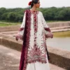 A vision of unblemished elegance, this unstitched ivory ensemble offers a refined take on the classic karandi silhouette. The shirt is beautifully elevated by intricate delicate embroidery and borring details. A striking contrast is achieved with the accompanying purple embroidered karandi shawl, which introduces a vibrant pop of color. The outfit is flawlessly completed with matching ivory trousers featuring tasteful embroidery accents, crafting a look designed to inspire effortless and captivating grace.