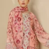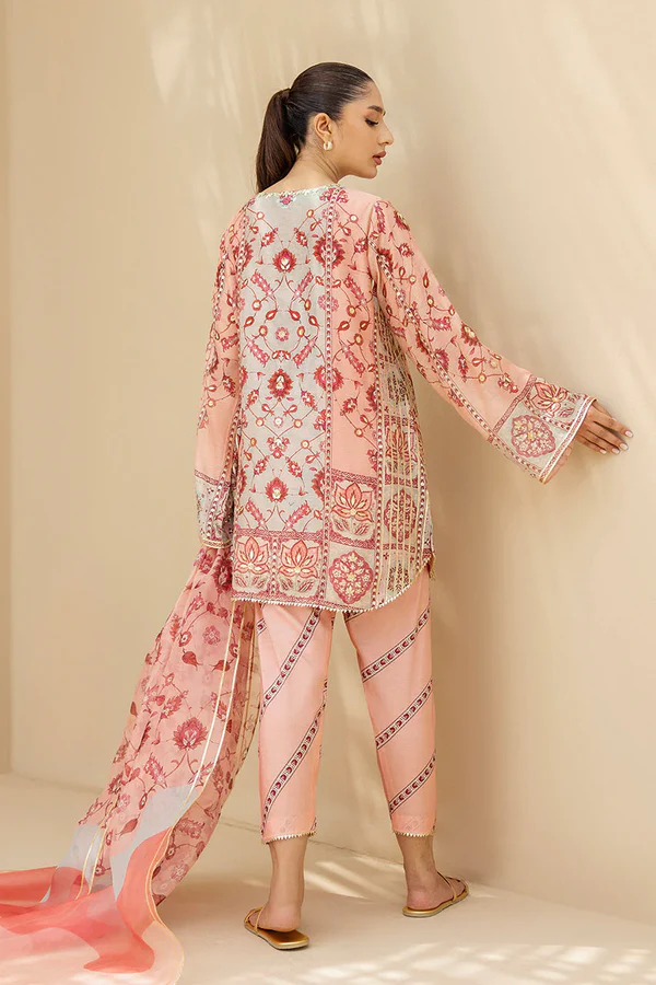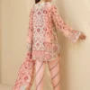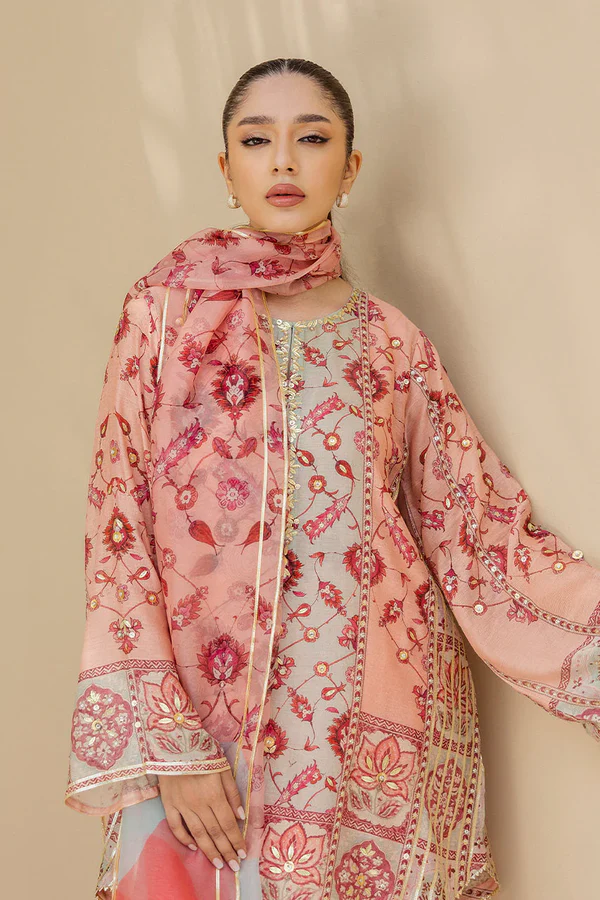 Cool, calm and quietly luxe, this relaxed kurta features intricate sequin and gota embroidery over a printed cotton net canvas in the lightest hues of millennial pink and blush. It is paired with a matching pure rawsilk shalwar embellished with delicate sequin vines, and a diaphanous organza dupatta that flows in a dreamy blend of powder blue, lemon yellow and blush/lilac.