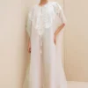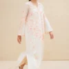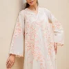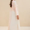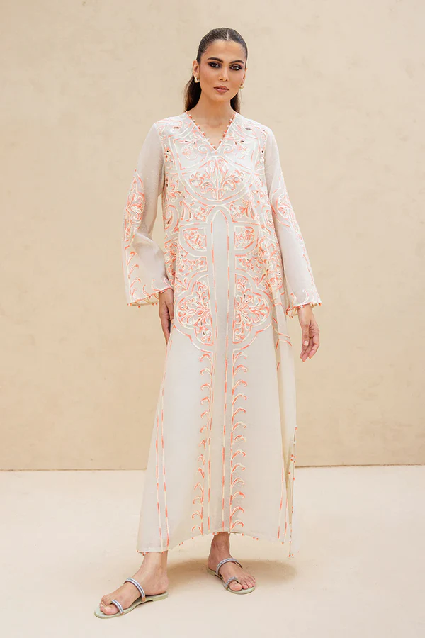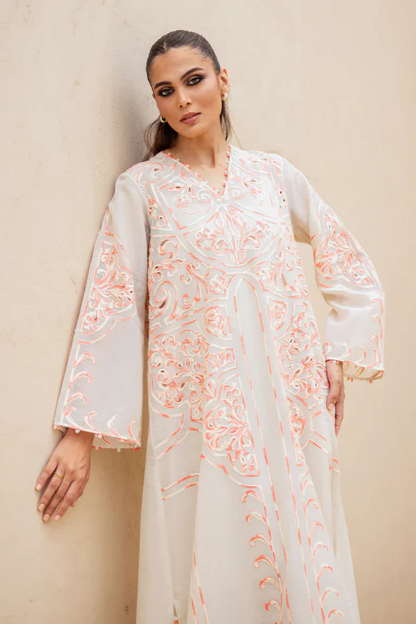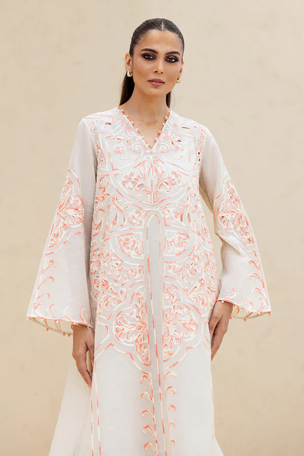 A canvas of muted ivory, this khaddi corduroy kaftan is adorned with coral and tonal resham embroidery in baroque inspired motifs, framed by delicate trellises that elongate the silhouette. The V neckline and flared sleeves, detailed with tonal 3D accents, lend depth to its artistry, shaping a piece of sculpted elegance.