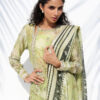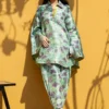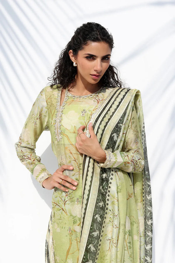 An elegant pistachio hued cotton net shirt in a long, straight silhouette is adorned with a serene botanical print, embellished accents, and an artisanal asymmetric neckline. A pre draped cotton net dupatta, finished with a contrasting border and tassels, is layered over a matching crepe tube top and straight fit trousers for a modern, refined look.