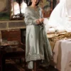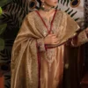 Draped in luxurious silk, this ensemble from our collection boasts intricate hand-embellished details, featuring delicate gold threads that dances across the ensemble, adding a regal touch to every stitch.