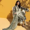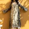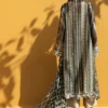 In an earthy palette, this ensemble layers deep olive and dove grey prints over a creamy almond canvas. The A-line shirt, crafted from cotton net, drapes with graceful ease and features a symmetrical botanical print reminiscent of damask artistry. Delicate fabric manipulation and button detailing accentuate the long sleeves and neckline. Paired with cream-toned pure raw silk culottes, the look balances rich artisanal patterns with a light, fluid silhouette.
