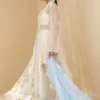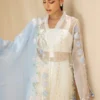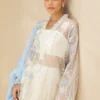 A luminous ivory pure rawsilk tube top is layered beneath a sheer organza kaftan shirt, adorned with appliquéd florals in soft lilac, peach and powder blue. Scalloped edges and delicate resham embroidery lend a whisper of whimsy. It is paired with crushed khaddi silk flared pants that cascade into soft swirls at the hem. A misty blue organza dupatta, finished with scalloped floral vines along the embellished borders, completes the look with a sense of quiet romance and understated elegance.