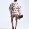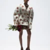 An ivory structured jacket with a V-neckline and elegantly sculpted with voluminous shoulders that create a striking arch. Crafted with meticulous detail, it is enriched with custom-designed jewels featuring intricate patterns and ruby stones artfully set throughout, adding a luxurious and timeless touch.