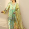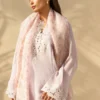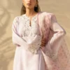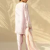 Rendered in a delicate whisper of lilac, this breezy khaddi corduroy kurta is adorned with intricate cutwork lace along the neckline, cuffs, and hem, exuding effortless sophistication. A diaphanous organza dupatta with a lilac hued cherry blossom inspired print adds a touch of whimsy. Paired with tailored pure rawsilk tulip pants edged in scalloped detailing, it redefines minimal elegance with poetic restraint.