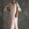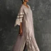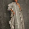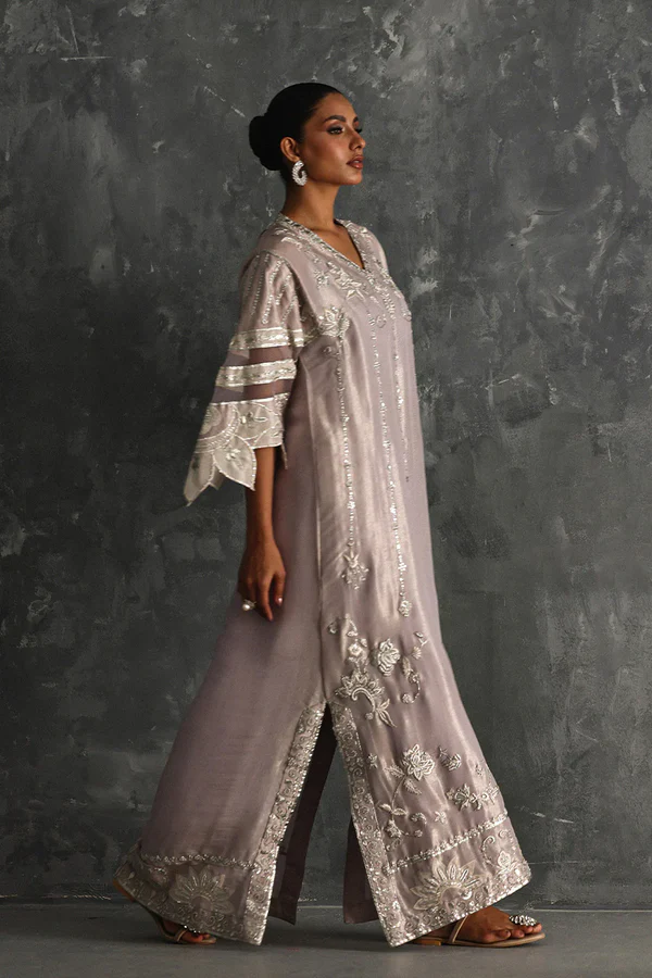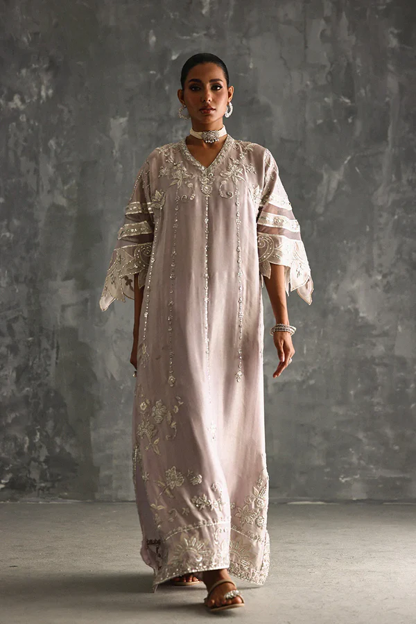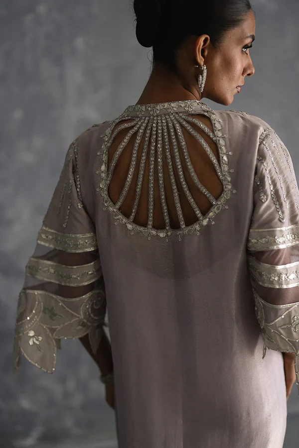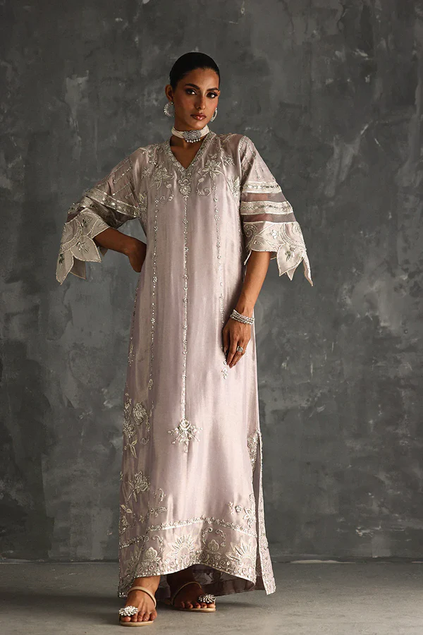 An effortless kaftaan, cut from lilac meysuri, ‘Astra’ showcases fine craftsmanship with resham, kamdani and zardoze embroidery. Beautifully crafted peek-a-boo organza sleeves with meysuri applique & worked in bold gotta work accentuate the look! A showstopping back with an exaggerated keyhole make this outfit an apt choice for the festive season!