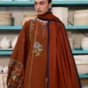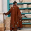 This elegant three-piece outfit features a rust-colored khaddar A-line shirt, beautifully adorned with intricate embroidery, delicate lace details, and boring technique accents. The highlight of the shirt is its balloon sleeves, also intricately embroidered. It is paired with matching embroidered culottes and completed with a stunning embroidered shawl.