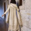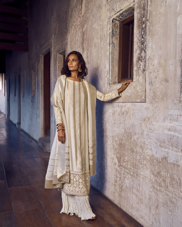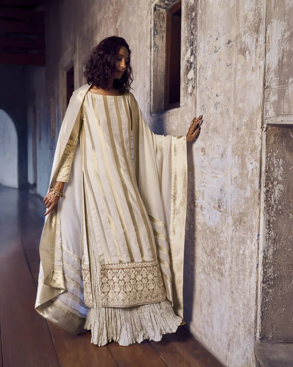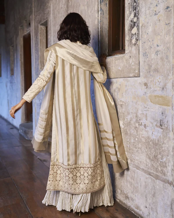 Dupatta: It is crafted in-house made ivory pure cotton fabric elevated with integrated zari stripes. The edges are finished with gold lama tissue.