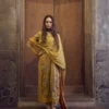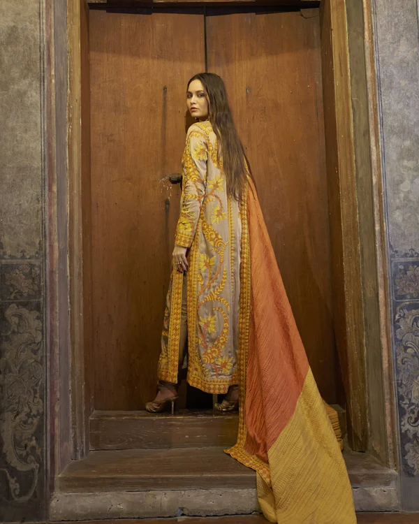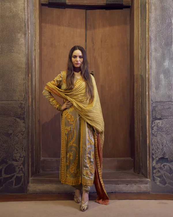 Dupatta: Crafted from a cotton silk blend features a striking crushed (crinkle) finish showcases a vibrant color combination of mustard and rust define by embroidered borders running all over it’s edges.