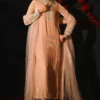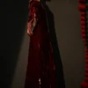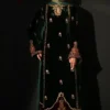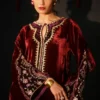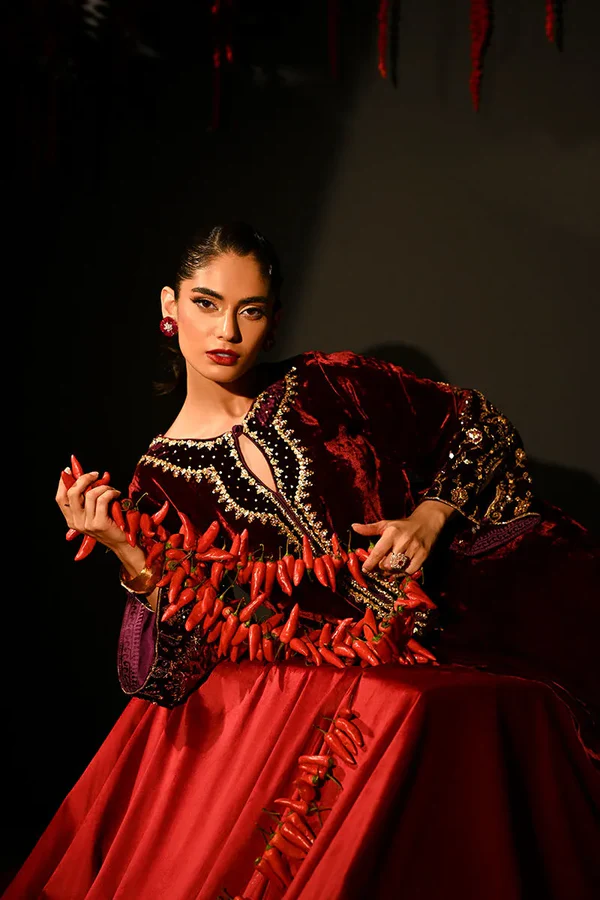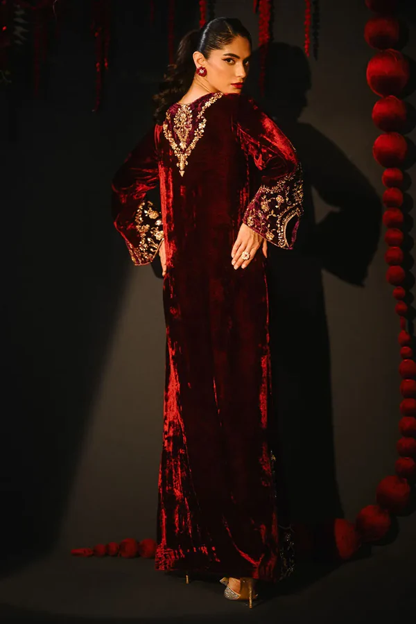 This elegant narrow kaftan features a maroon base with plum color-block appliqué on the neckline, sleeves, and daman. The round neck with a subtle slit adds a modern touch, while intricate pita, gota, cut dana, and pearl work enhance its refined detailing. Little keyholes on the bell sleeves and tassels on the chaak bring playful movement and charm, making it a perfect blend of sophistication and artistry.