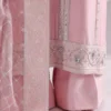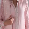 This refined rose gold ensemble is crafted from premium raw silk, featuring a shirt adorned with delicate embroidery and intricate embellishments along the hem and inserts. The elegance of the shirt is perfectly complemented by chic palazzo pants, enhanced with beautifully block-printed motifs for a touch of artistry. The look is elevated with an organza dupatta, showcasing a printed and sequined jaal, framed with a four-sided embroidered border for a luxurious finish. Designed to exude sophistication and grace, this outfit strikes the perfect balance between contemporary charm and timeless appeal. Ideal for festive occasions and formal gatherings, it is a true vision of beauty.