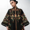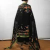 A long black shirt adorned with multicolor floral embroidery and subtle sequins is complemented by matching bell sleeves for a refined, graceful silhouette. It is styled with black dyed culottes featuring an embroidered border, while a digital printed silk dupatta adds a contemporary and elegant finish.