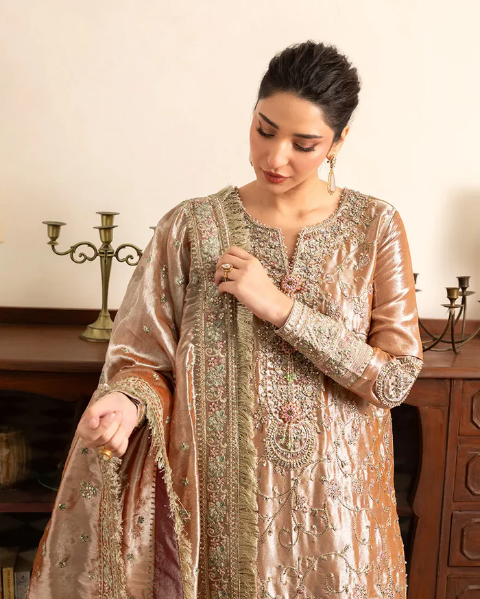 • Zari tissue dupatta featuring fringed edges and delicate floral motifs.