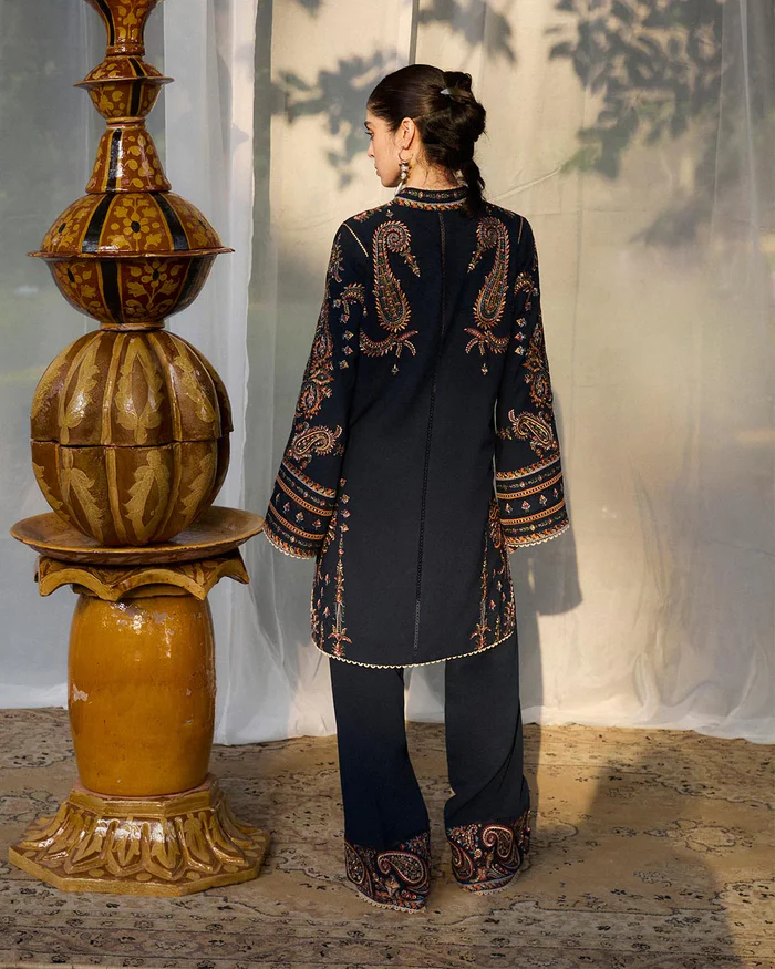 Description:Â A mid-length blue shirt, embroidered in Kashmiri motifs and adorned with tassels. Bell sleeves and straight pants carry the design language forward, while the embroidered scarf ties it all together in effortless grace.