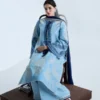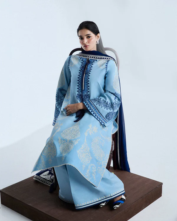 Description: Light blue long shirt adorned with delicate monochrome embroidery and tassel-accented neckline, featuring bell sleeves with elegant slits. Paired with matching full-length flared trousers edged with monochrome embroidery, and completed with a dark blue chiffon dupatta richly embroidered in monochrome. Refined, graceful, and timeless.