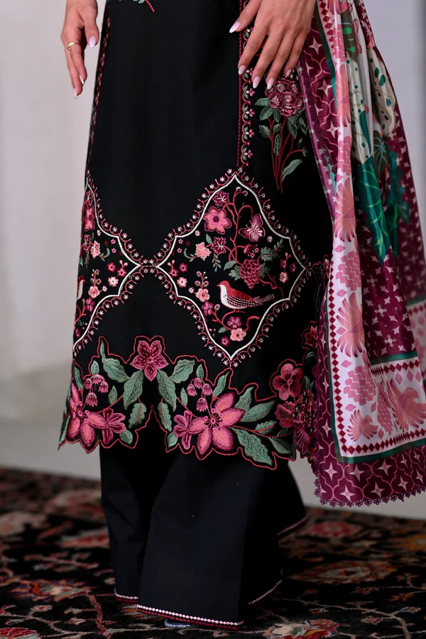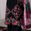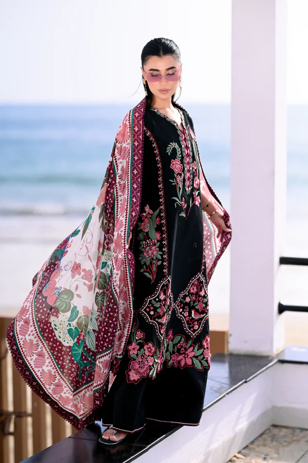 This luxurious three-piece lawn set in deep black exudes both boldness and elegance. The shirt is beautifully adorned with intricate floral embroidery in rich shades of pink, magenta, and green, creating a stunning contrast against the dark fabric. The vibrant dupatta, with its combination of floral and geometric patterns in complementary hues of magenta, pink, and green, adds a refreshing touch of color and completes the ensemble with its soft, flowing fabric. The set’s timeless design is perfect for evening gatherings or festive occasions, offering both style and sophistication. Paired with matching culottes, the outfit offers a modern twist on traditional luxury, making it a must-have for those who seek an elegant yet contemporary look.