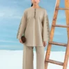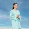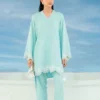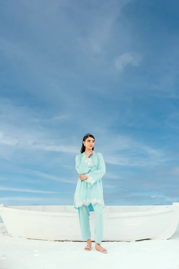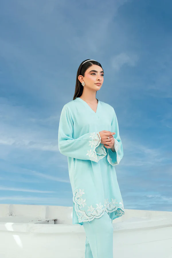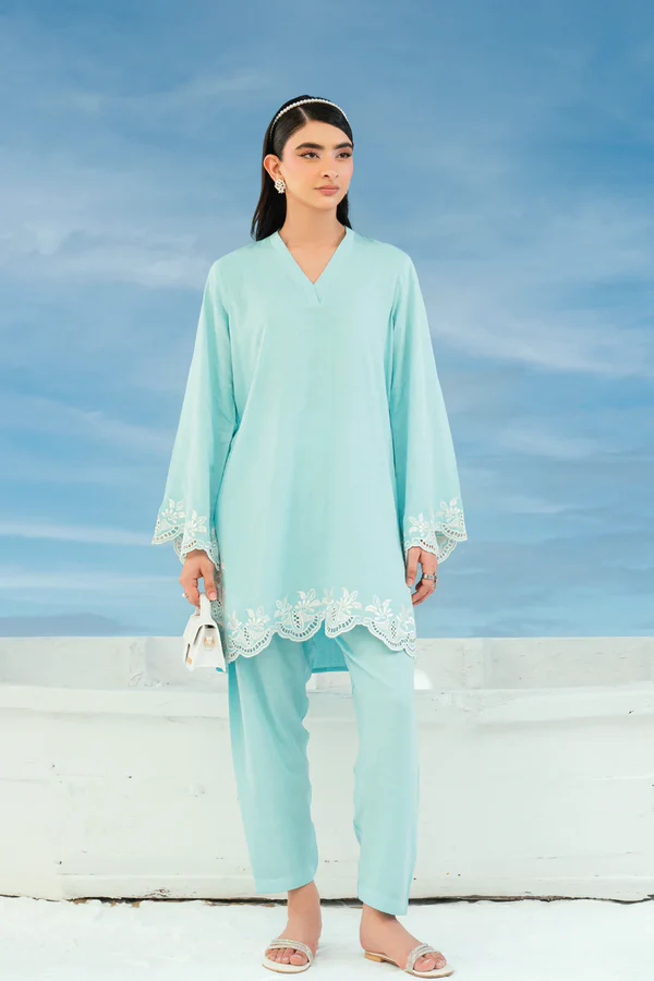 This outfit features a short kurta paired with a shalwar enhancing the overall silhoutte. While the shirt comprises of intricate cutwork and scallop detailing on the edges of the sleeves and hem of the shirt along with floral embroidery to enhance the look.
