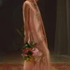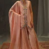 Tailored from shimmering zari net in a delicate peach hue, its surface catching the light with a subtle, ethereal glow. The jacket-style shirt features a scalloped front, richly hand-embroidered with French knot roses, trailing vines, and sequins that glisten with every movement. Paired with an embroidered flowing lehnga in matching zari net, the look is completed by a medium silk dupatta—ombre-washed with delicate sequence work. Feminine yet contemporary, this piece transitions effortlessly from daytime celebrations to evening elegance.