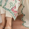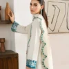 An exquisitely tailored 4-panelled shirt crafted in a serene white base, featuring white-on-white jaal embroidery for a timeless, textured elegance. The front-open patti stands out in a blue base, delicately adorned with parsi gara-inspired embroidery, showcasing hints of red, coral, and peach for a subtle yet striking contrast. The sleeves are finished with a color-blocked border in deep navy, grounding the look with a bold accent. Paired seamlessly with straight-fit pants, the outfit is elevated by a beautifully coordinated scalloped dupatta, finished on all four sides, adding finesse and feminine charm.