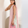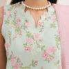 This long-length printed shirt combines elegance and vibrancy, featuring delicate floral embroidery on a soft apple green base. The embroidery, crafted in pinks, yellows, and subtle white accents, is enhanced with schiffli embroidery in white, adding a beautiful touch of texture and intricacy to the design. Enhanced with color block tatami border on hem the shirt is further decorated with fine stitching details, giving it depth and structure for a sophisticated, modern look. Paired with a contrasted pink dupatta, this ensemble is completed with a soft yet bold pop of color. The dupatta is enhanced with a printed floral border, beautifully complementing the shirt’s delicate embroidery. The outfit is finished with culottes, combining modern comfort with refined style and fluidity.