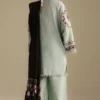 An aqua blue khaddar shirt and trouser paired with a brown shawl, a refreshing yet earthy balance made for the winter season.