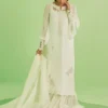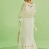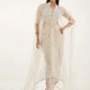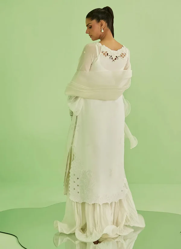 Paired with crushed pants that introduce gentle texture, the look is completed with a draped organza dupatta, flowing effortlessly to enhance its light, airy appeal.