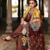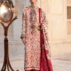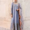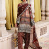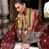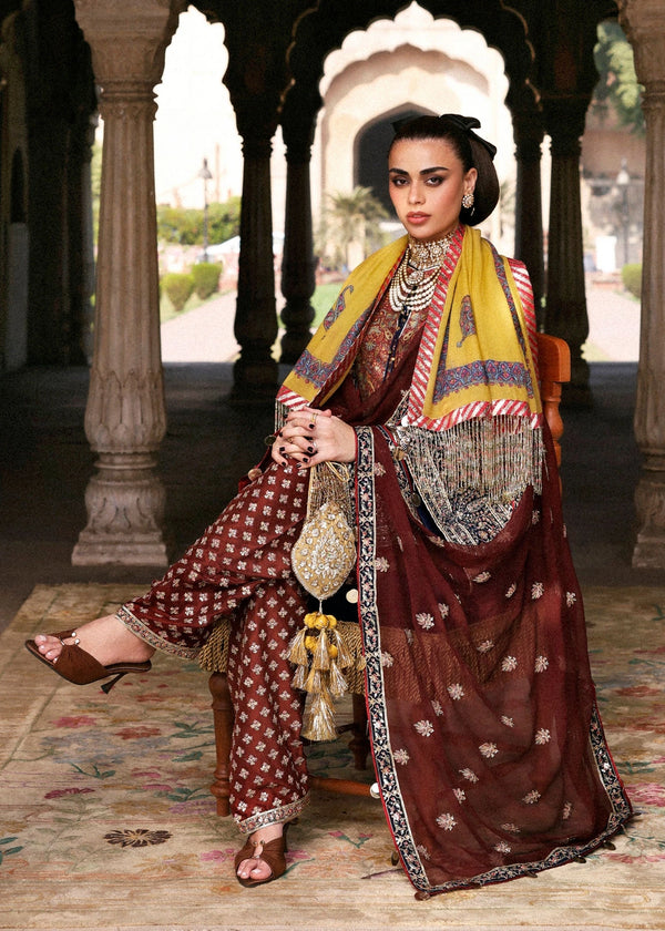 Brick red printed raw silk shirt with embellished electric blue velvet borders on the hem and sleeves, finished with embellished tassel detailing. Paired with embroidered raw silk Pakistani shalwar and a chiffon dupatta featuring contrasting blue raw silk borders and sequin tassels on all four sides.