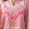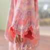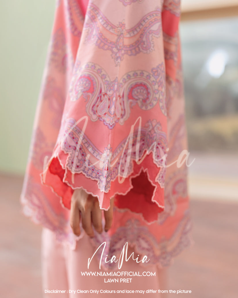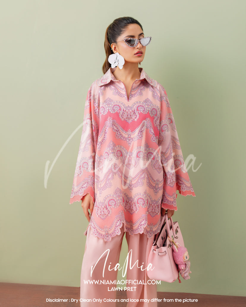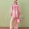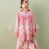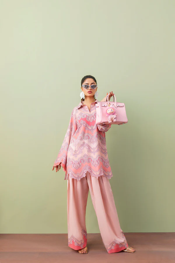 A two-piece printed set in soft shades of pink with delicate tonal motifs. The collared neckline adds a tailored touch, while cutwork embroidery details the sleeves and shirt hem. Paired with a flowing farshi shalwar for an elegant yet relaxed summer look.