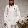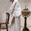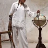 Cemra in White Linen Cotton CO-ORD Set from the Image Fusion collection, features an embroidered shirt with resort collar & full-length sleeves paired with matching pants.