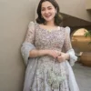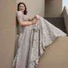 Masterfully crafted, Chanaah is a statement silhouette on a light grey palette. The organza choli and Korean Raw Silk lehenga feature lavishly adorned badla, resham and mirror embellishments. This set comes paired with an embroidered organza dupatta making it the perfect choice for your special occasions.