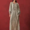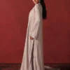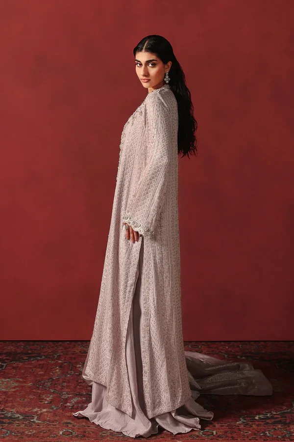 This lilac ensemble from AMMARA KHAN features a long, flared shirt made in beautiful chikankari intricately detailed with pearls, sequins, and fine thread-work. The design is highlighted by hand-embellished floral motifs on the neckline, offering a soft yet festive look. It is paired with crushed flared pants for a modern silhouette and finished with a luminous dupatta. This outfit oozes with sophisticated craftsmanship making it a standout choice for any celebration.