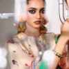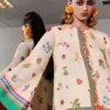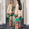 A printed peach cream mid-thigh length silk shirt featuring a clean crew neckline and front button loop detailing. The silhouette is elevated with multicolored borders that create a soft, color-blocked effect along with a high-low front back detail. Paired with straight ankle-length pants designed in contrasting borders of pink and green on each leg — adding a playful, modern twist to a minimal base.