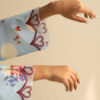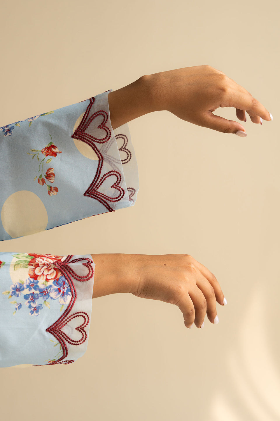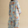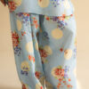 Our overall blue set has a classic floral and polka printed kurta with contrast embroidery details on sleeves and pockets. It is paired with a matching farshi shalwar to complete the look.