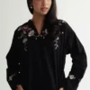 A loose-fit black kurta adorned with floral ghara embroidery on the front and sleeves, paired with a farshi shalwar for an effortless traditional look.