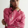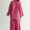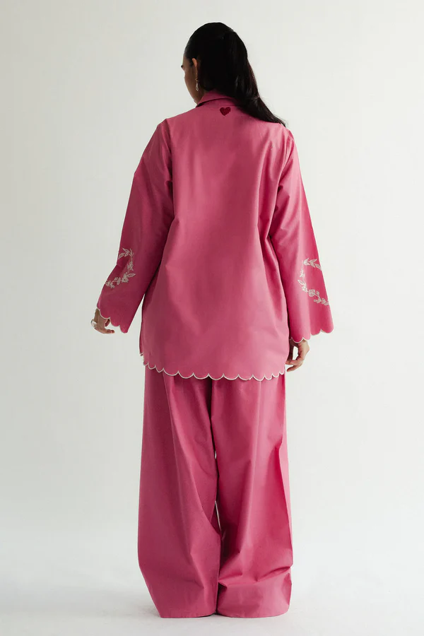 A pink button-down shirt with scalloped embroidery on the hem and sleeves, paired with a farshi shalwar for a graceful finish