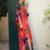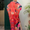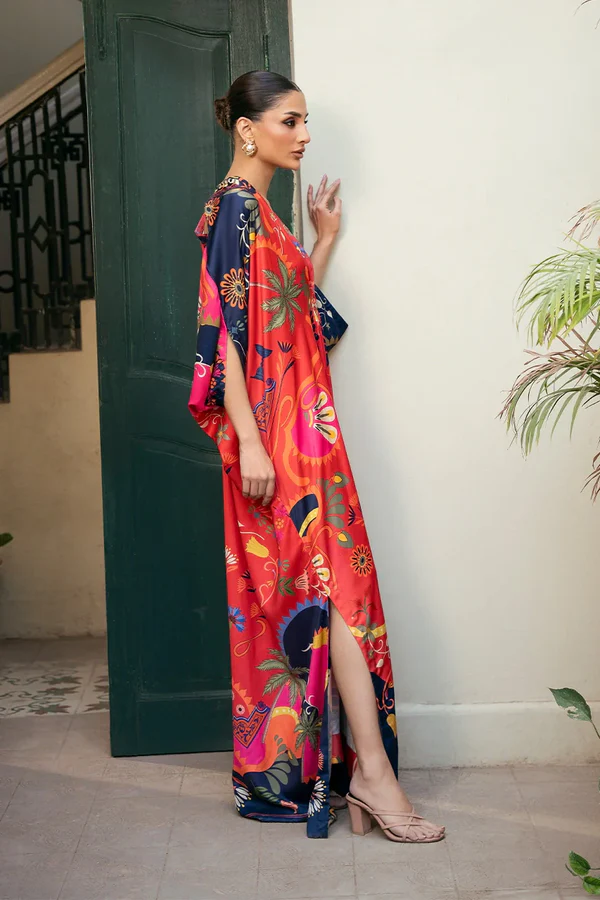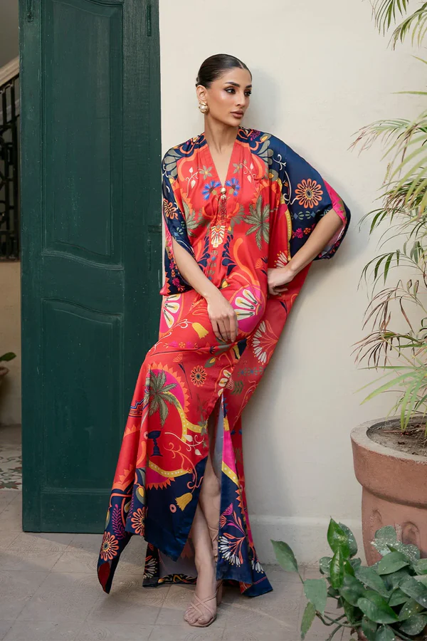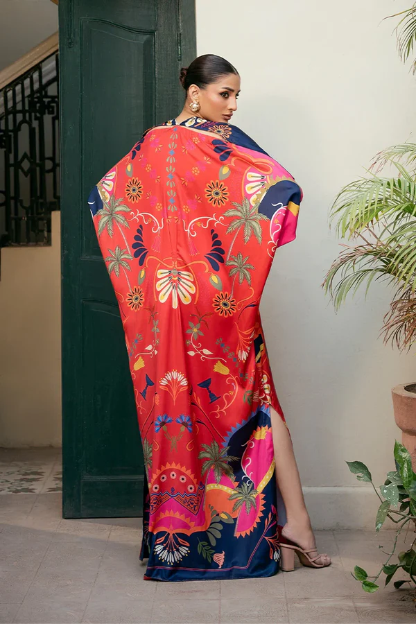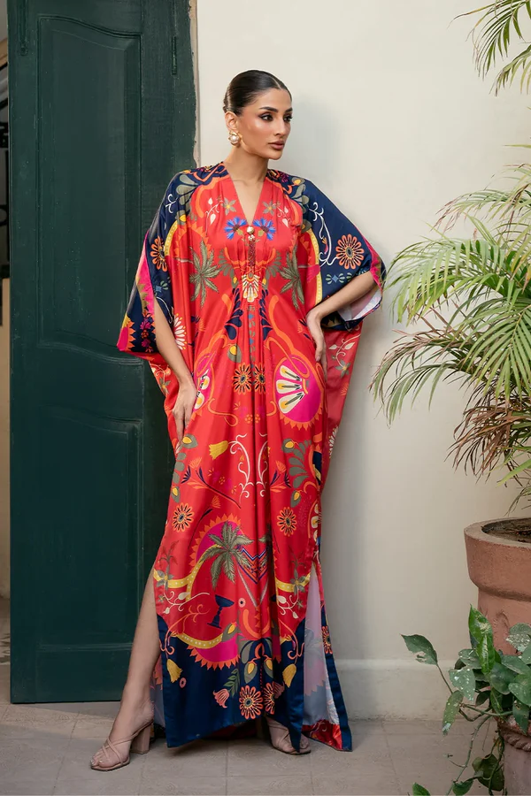 The Crimson Hill kaftaan crafted from Silk is designed with a clean front placket and enhanced with a delicate beaded tassel. Floral and abstract prints cascade across a colour blocked base of red and navy, offering a perfect balance of elegance and relaxed glamour.