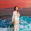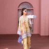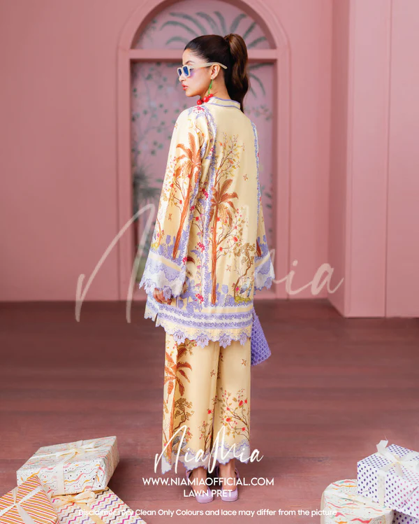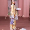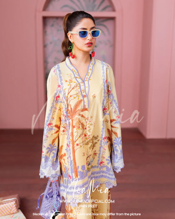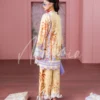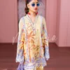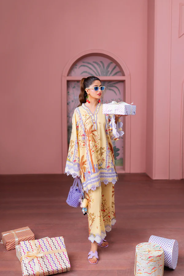 A two-piece printed set in a warm yellow base, lifted with soft lilac floral motifs. The neckline features a gentle V-cut framed with tonal embroidery, while airy cutwork details finish the sleeves. Paired with a matching printed izaar for an effortlessly cheerful summer look.