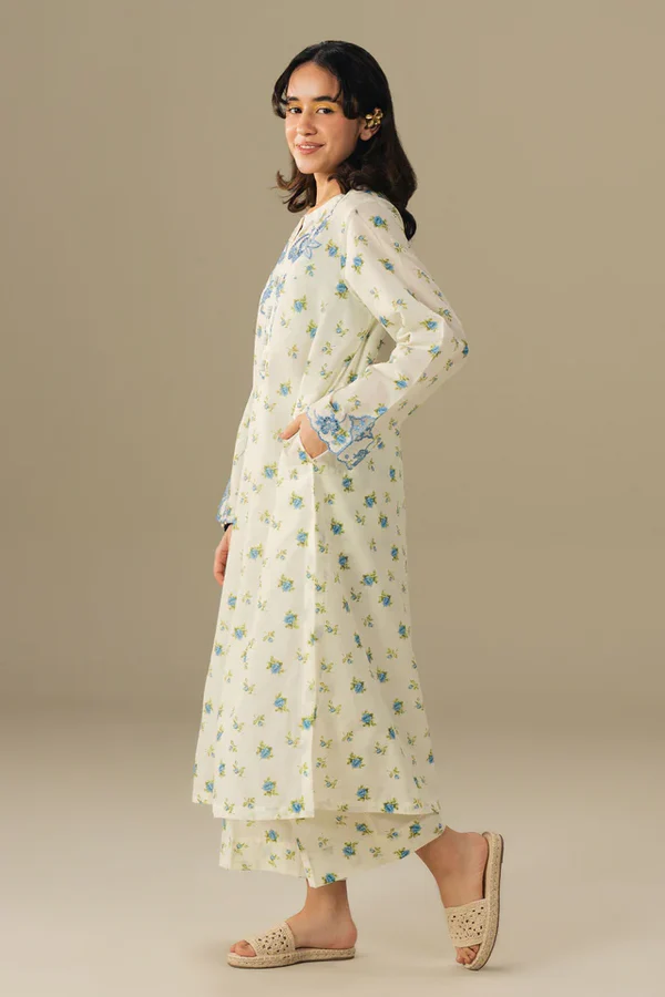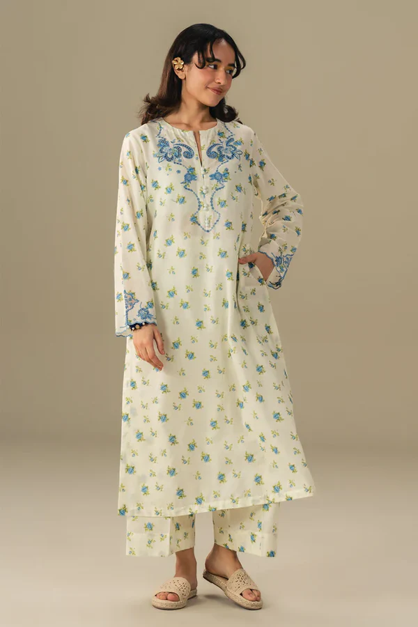 Chic, comfortable, and effortlessly stylish. This printed kurta trouser set features delicate embroidery on the neckline and sleeves, crafted from soft fabric for a flattering silhouette. Perfect for everyday elegance with a modern, lively touch.