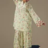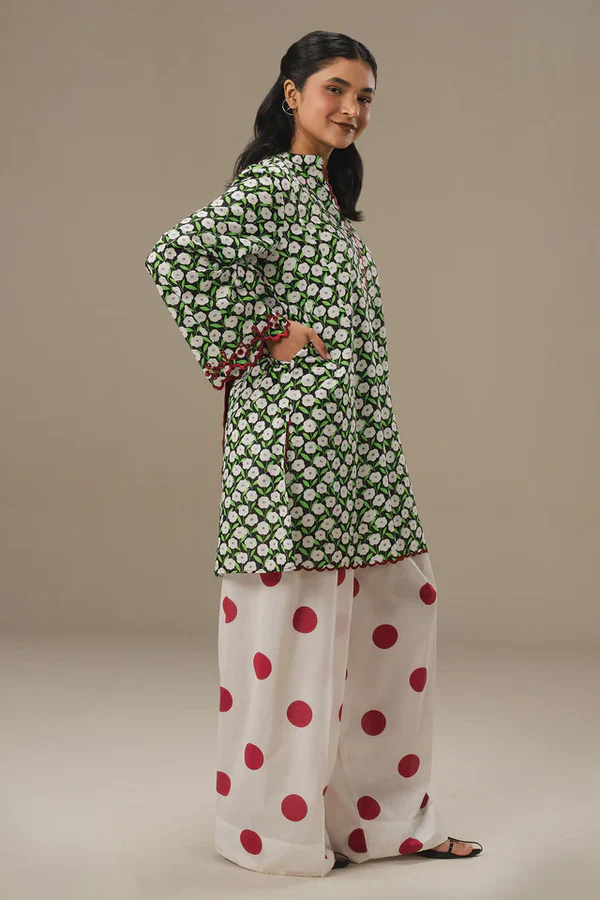 A printed cambric shirt with subtle light embroidery, paired with a playful cambric shalwar dotted with red accents. Fun, easy to wear, and full of thoughtful details that make the set effortlessly stylish.