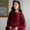 Experience the alluring splendor of ‘Garnet Maroon,’ where a breathtaking shade of red commands attention. This long kaftan-style shirt is adorned with opulent Rashem and sequin embroidery, beautifully enriched with French lace-inspired patterns that speak of refined luxury. The neckline is tastefully decorated with delicate crystal embellishments, while wide open sleeves add a touch of dramatic elegance. Finishing touches include fine laces, further enhancing the outfit’s exquisite details. Paired with a matching net dupatta and sleek cigarette pants, as it exudes a resplendent charm destined to leave an indelible impression