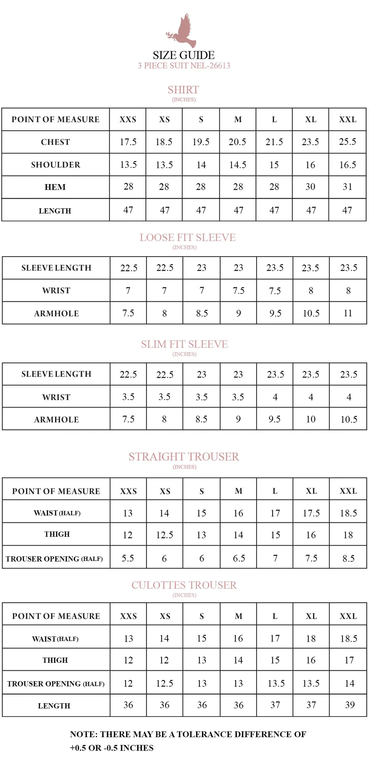 - Disclaimer: There may be a tolerance difference of +0.5 or -0.5 inches.