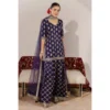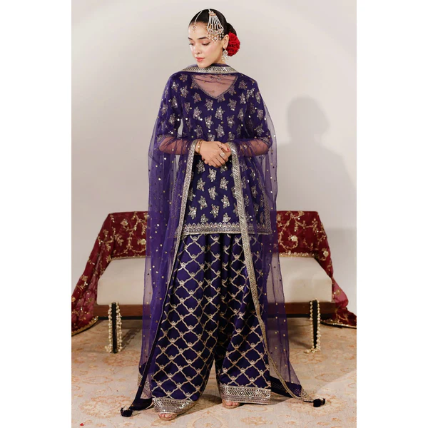 Deep Violet shamooz silk shirt and farshi shalwar with tilla, sequin, badla and resham embroidery paired with a net mukesh dupatta.