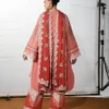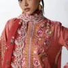 A long pink shirt adorned with multicolor floral ghara embroidery is elegantly enhanced with organza patches on the daaman, while the bell sleeves feature matching embroidered borders, creating a refined and graceful silhouette. The ensemble is paired with matching embroidered trousers accented with organza borders, and a monochrome embroidered chiffon dupatta completes the look with a delicate, sophisticated finish.