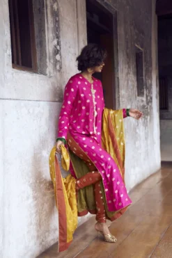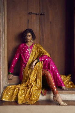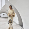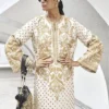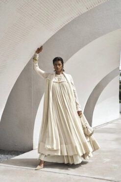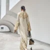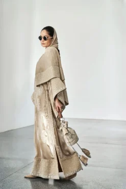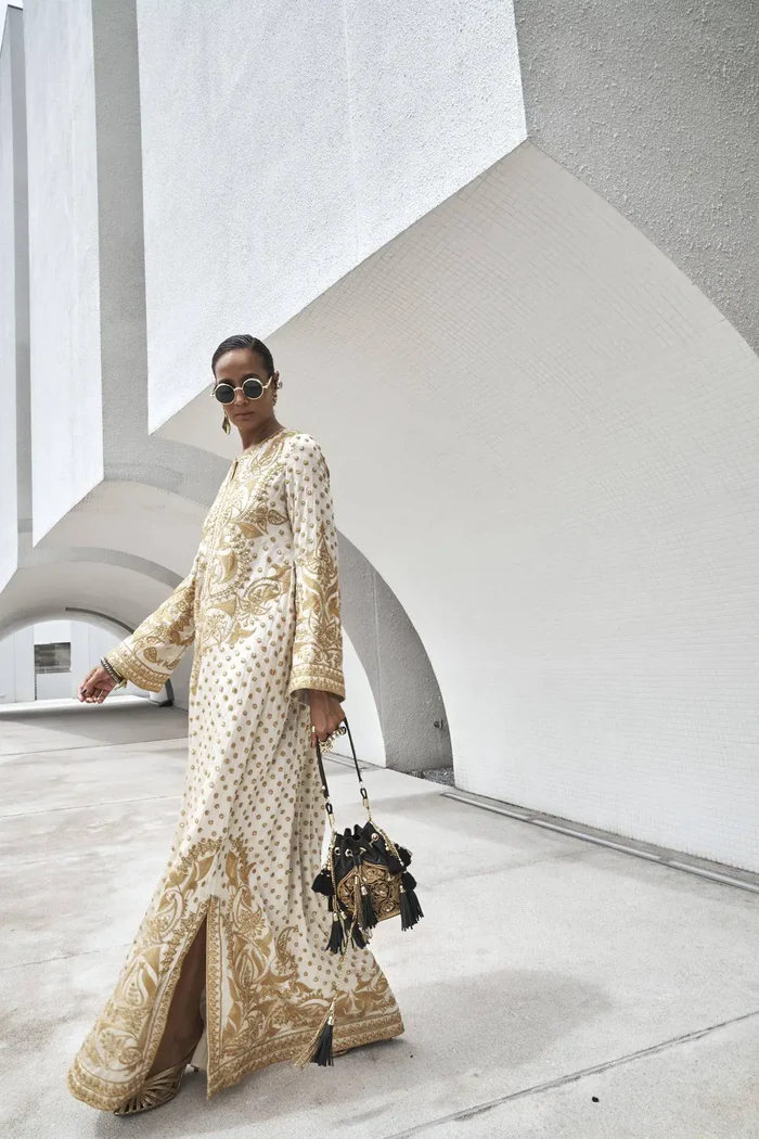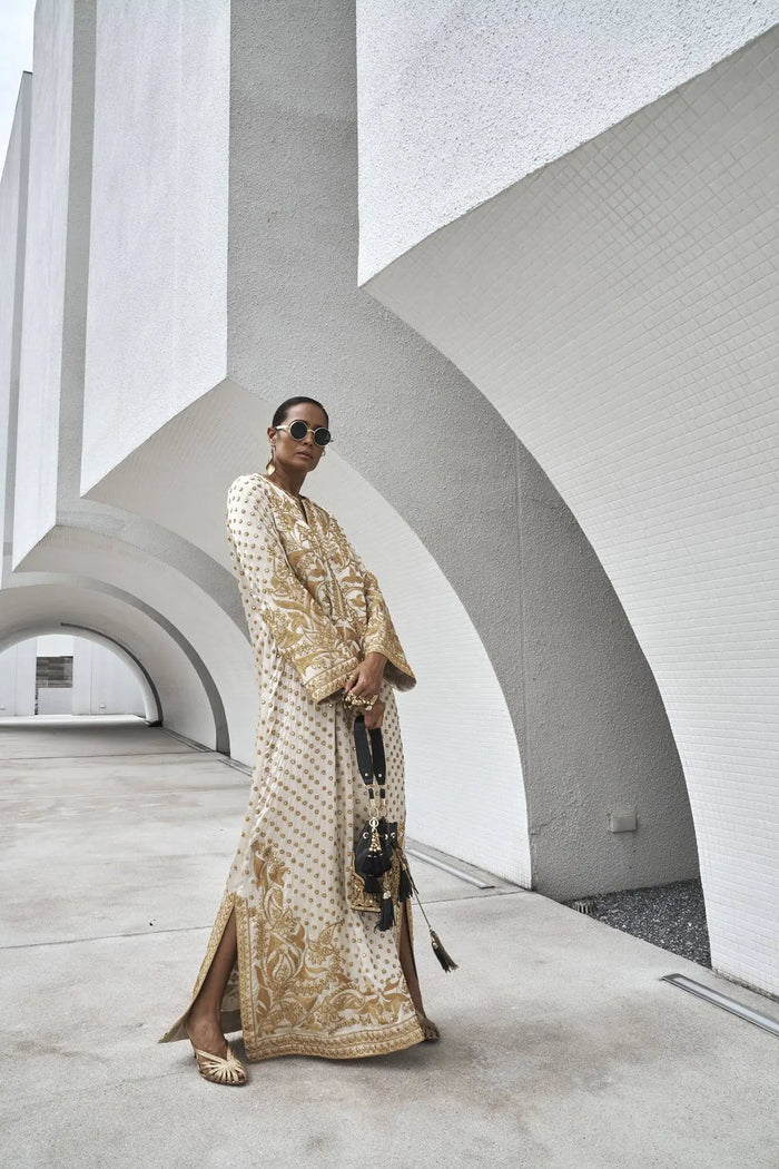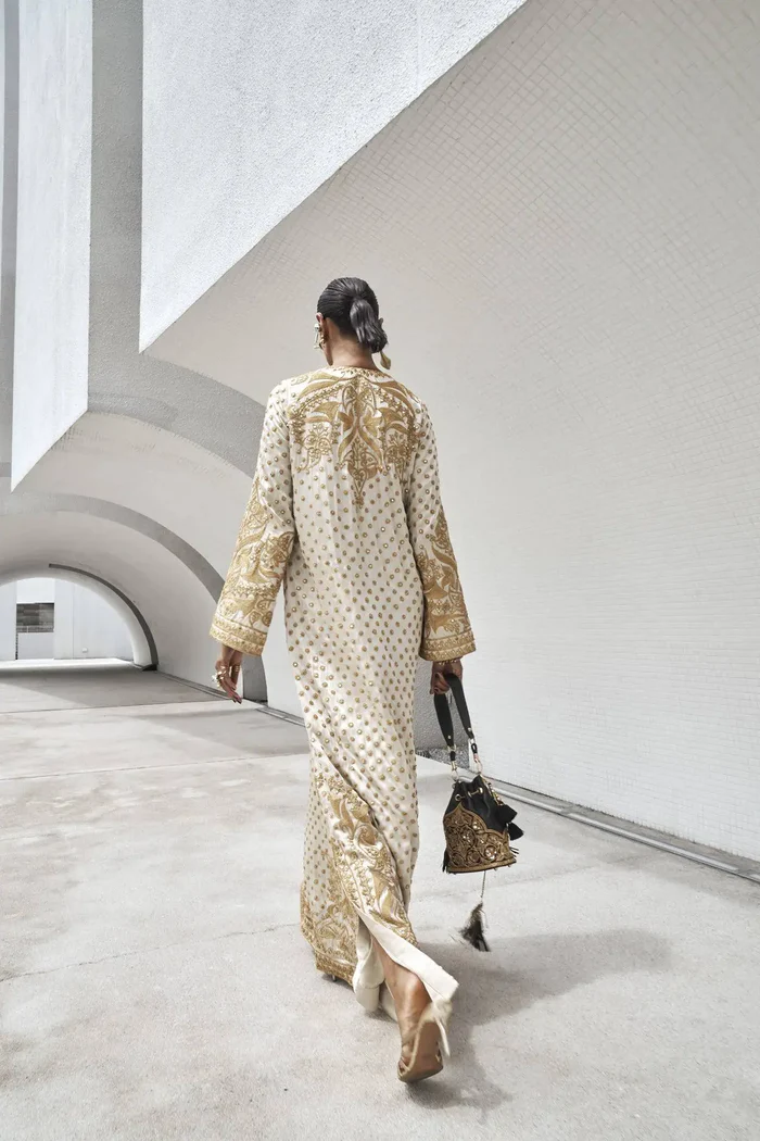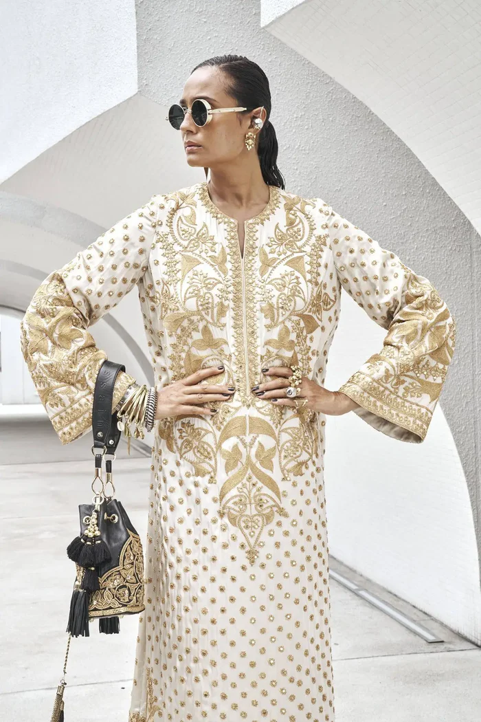 KAFTAN: Ivory pure silk floor length kaftan with side slits, all over golden dori and sequins work