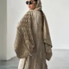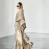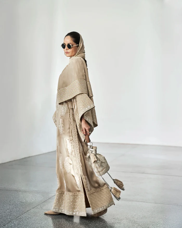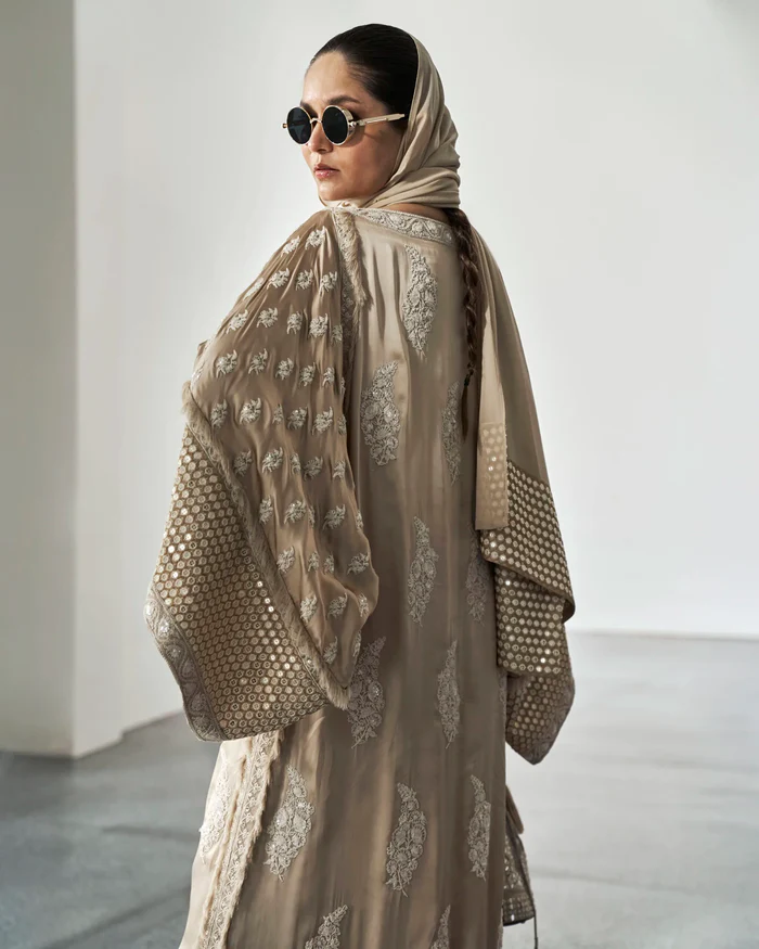 Kaftan: Beige pure silk heavily embroidered with thread, zari and sequins work all over with detailings of fringes on sleeves, sides and daman.