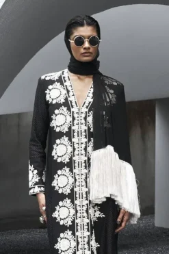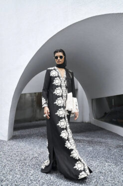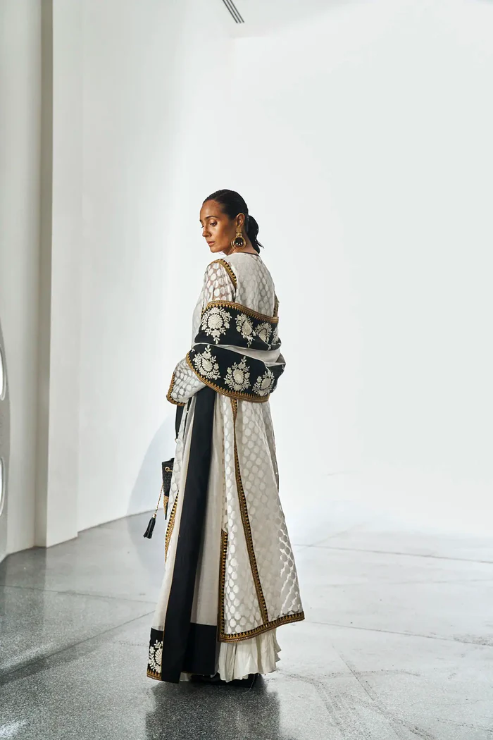 Dupatta: Dupatta is made with white pure silk net using technique of thread, marori and sequins work on black pure raw silk all over borders.