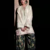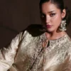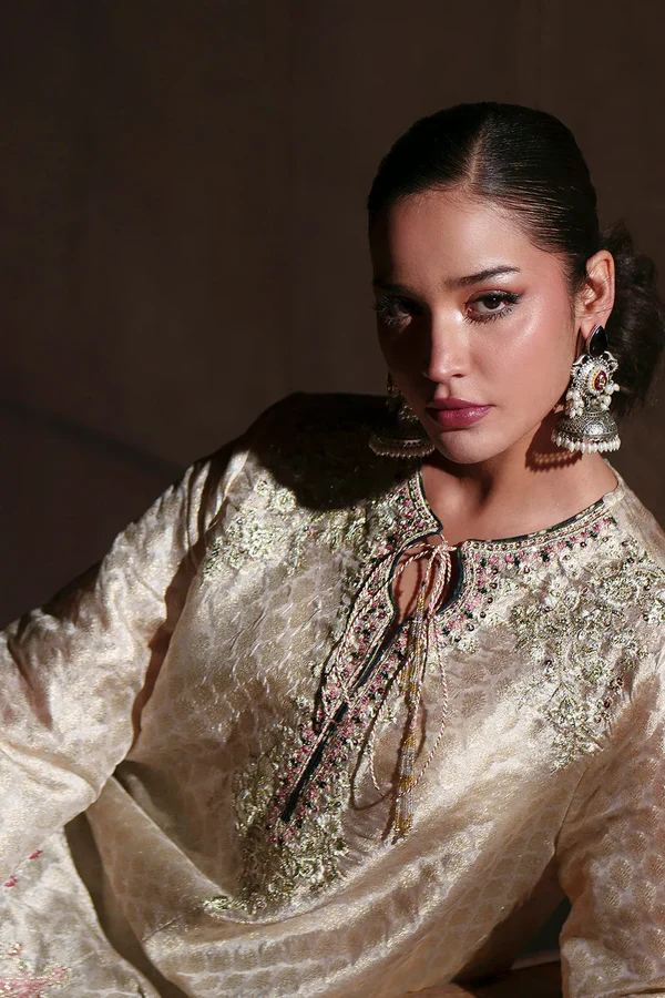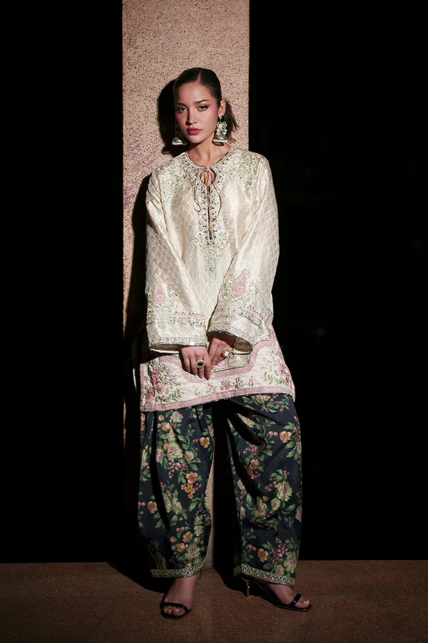 Command attention with this striking two-piece ensemble, where rich contrast meets refined craftsmanship. The off-white kurta is beautifully adorned with intricate floral and paisley embroidery in shades of green, pink, and gold, flowing gracefully across the neckline, sleeves, and hem. Paired with a bold black wide-leg shalwar, detailed with vibrant floral prints and subtle golden embroidery along the hem, the outfit creates a graceful yet statement-making silhouette. Perfect for festive occasions, grand celebrations, or moments that call for unforgettable style.